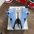 The UNC University Blue Jordan 4 Retro celebrates the iconic Carolina Blue colorway that pays homage to Michael Jordan's college roots. Featuring premium suede and mesh construction with signature Air Jordan 4 detailing, this lightly worn pair delivers timeless heritage and unmistakable style for collectors and enthusiasts who appreciate the legacy of the Tar Heels.