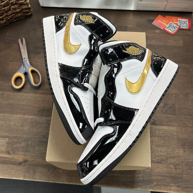 Patent Black White Metallic Silver Metallic Gold Jordan 1 Mid SE (No Lid)